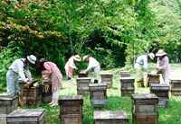 3.夏天 紫云英的开花期结束以后,蜜蜂转而飞向山林。山上的各类树木鲜花盛开,正是采蜜的好时机。因为蜜蜂越来越多,到了分巢的季节,要特别注意蜜蜂的分蜂。从春天到夏天的这段时间是我们养蜂人最忙也是最有意义的季节。