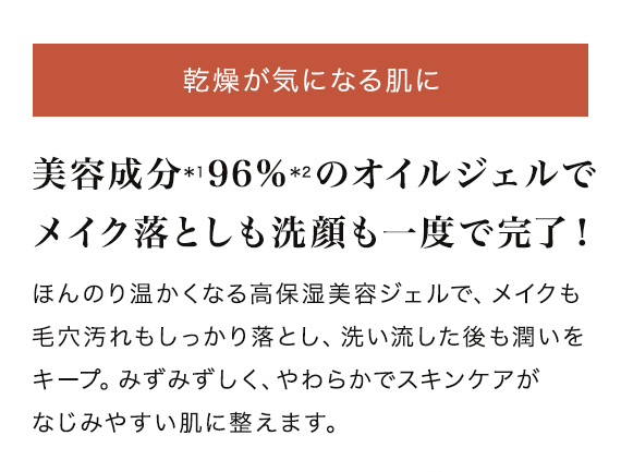 美容成分96%のオイルジェルで、メイク落としも洗顔も1度で完了!