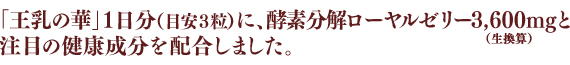 そして、ついに独自の技術で安全性と有用性を高めた酵素分解ローヤルゼリーを、1日の目安3粒中に、3,600mg(生換算)もの高含有を実現。さらに、健康への有用性が期待されるメリンジョレスベラトロールを配合しています。